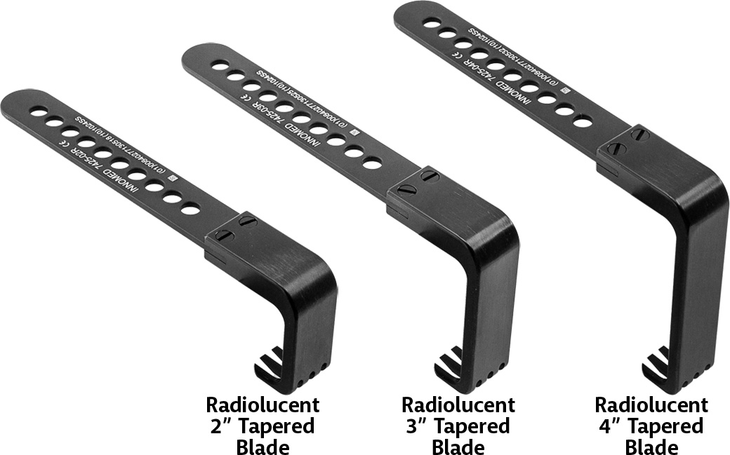 Optional Radiolucent Tapered Blades features a tapered blade for gentler soft tissue retraction with the benefit of being radiolucent. Not included in set.