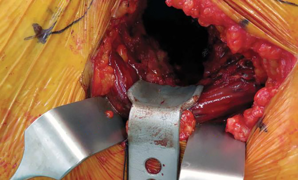 A self-retaining frame and retractor system designed for use during anterior total hip arthroplasty, the blades help retract the hip capsule and musculature, permitting an unobstructed view of the acetabulum while freeing an assistant