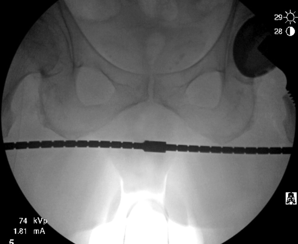 For use during intraoperative imaging while performing anterior hip arthroplasty to help determine implant fit, position, alignment and recreation of leg length and offset using the contralateral hip for reference
