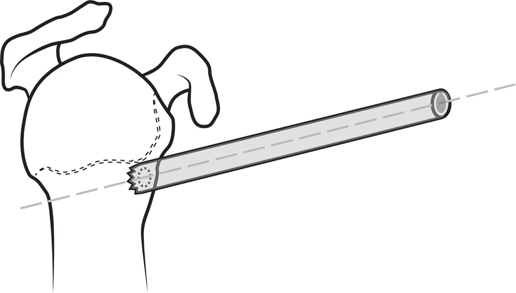 Designed to help facilitate mini-open sub-pectoral bicep tenodesis—by maintaining the trajectory of the drill with the cerrated end of the sleeve, the drilled humeral holes are easily found with standard percutaneous placement of the bicortical button