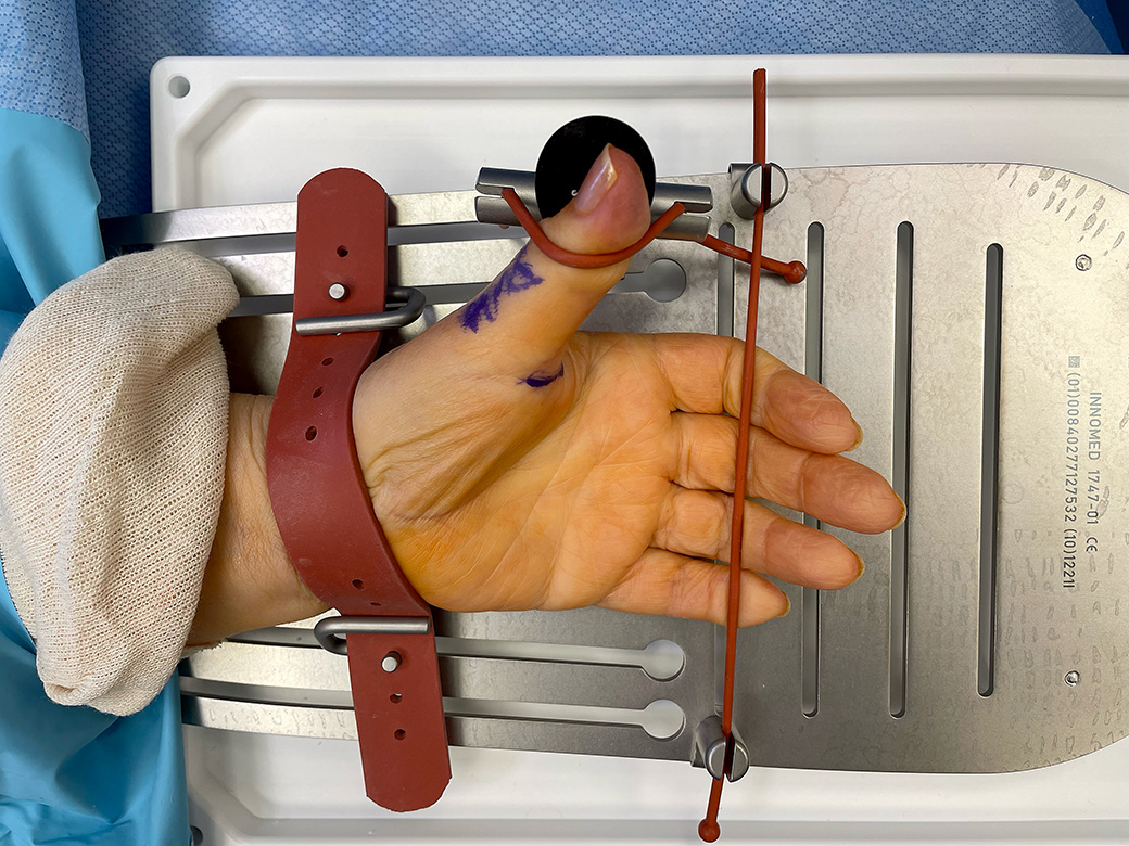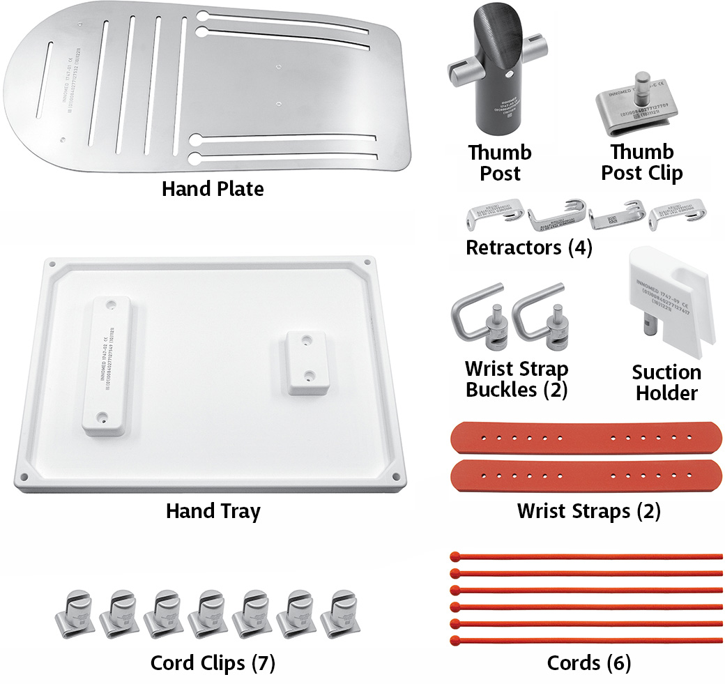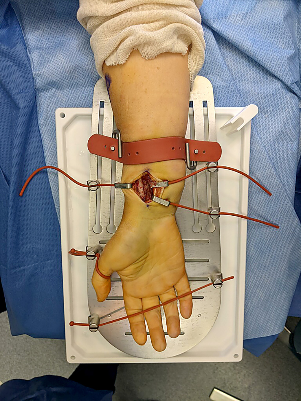 Designed to position and retract the skin for surgical exposures of the hand, wrist and forearm