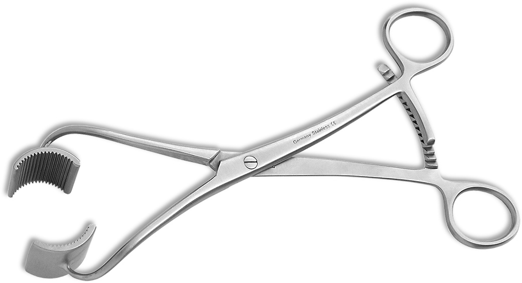 Designed to aid in the reduction of various fractures such as: spiral, transverse, compound, oblique, or butterfly. The clamp can also be used to secure a plate in place while the screw holes are being drilled and screws inserted. The fracture site can also be manipulated with the clamp being used as a lever. Teeth in the jaws for a better grip and a ratchet locking handle for use on various bone diameters.