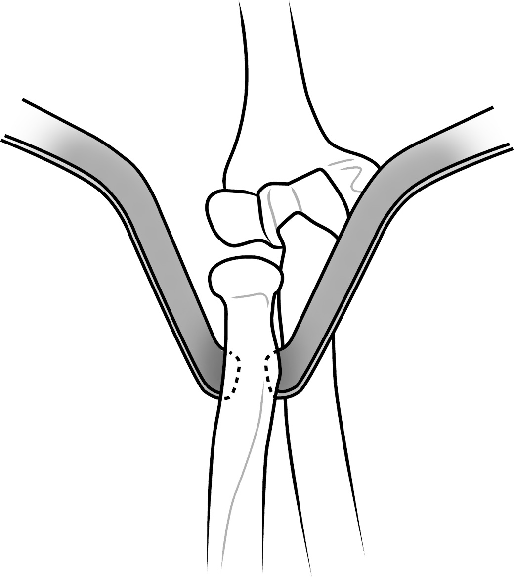 The blade design features an anatomically contoured distal end to hug the radius cortex. The smooth distal end helps to avoid deep penetration, and the width matches the width of the distal biceps tendon insertion site. The narrow curved handle design helps to optimize workspace and visualization.