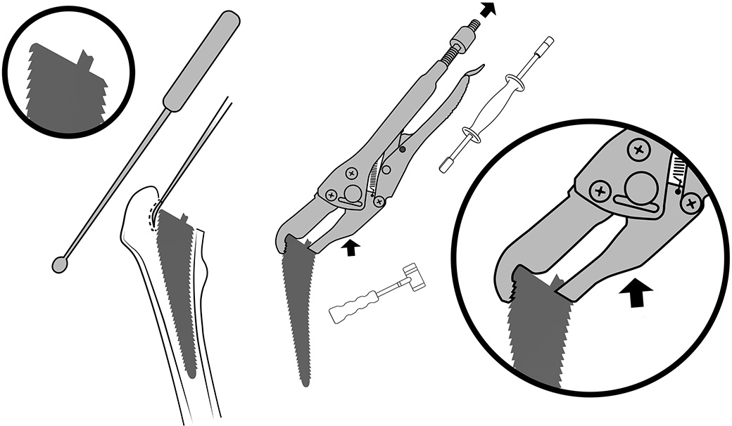 5.Remove broach by gripping vise grip handles and tapping with hammer on prominence of medial jaw. Alternatively or also apply extraction force with slap hammer.