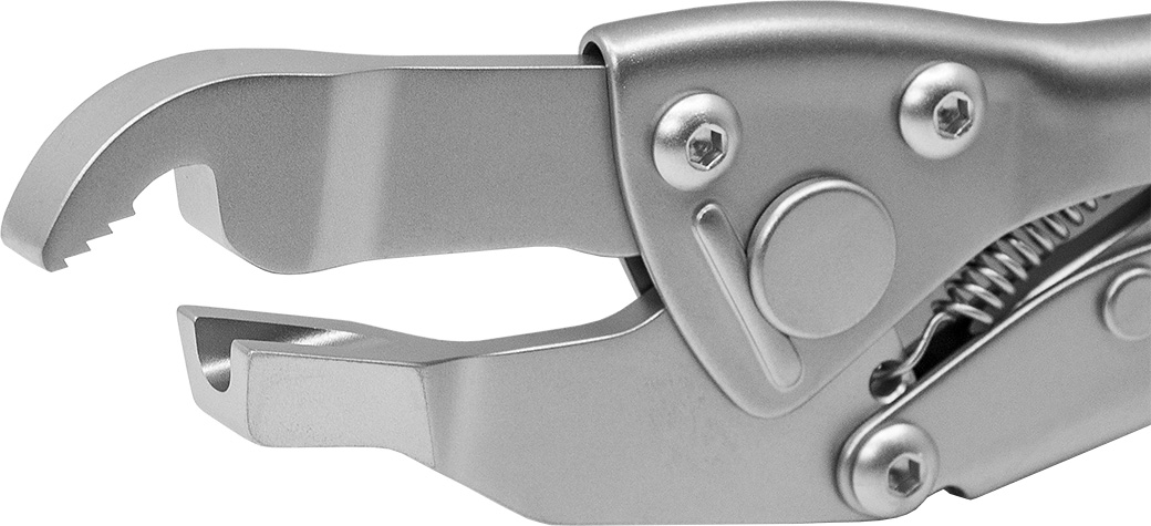 4.Apply slotted medial vise grip jaw to broken post with tip of jaw flush with broach top. Adjust vise grip jaw width to fit, then close and lock handles against resistance. The vise grip should feel secure and not wobble in relation to the broach.