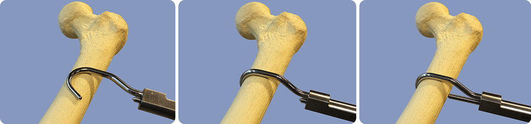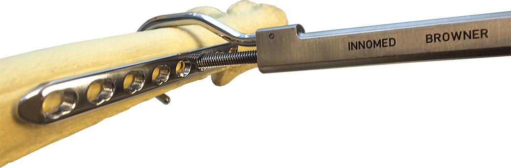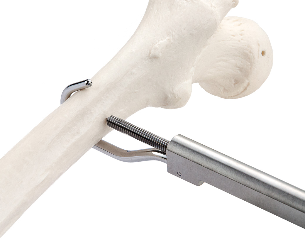 Designed to help hold a bone or bone plate for fixation, the clamp is inserted anterior to the bone, rotated to wrap around the bone, then screwed into the desired position