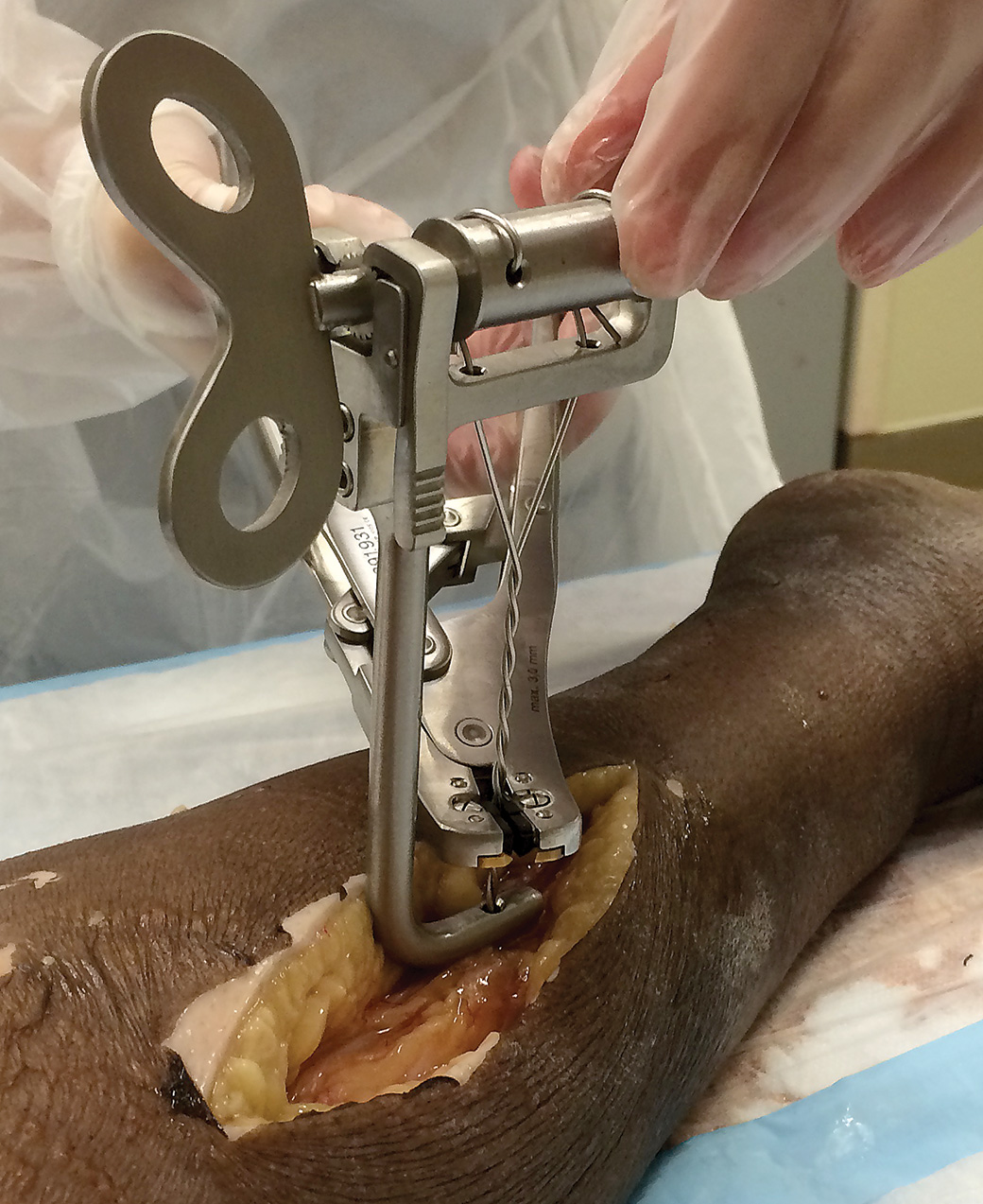 Wire is passed through the distal arm hole and into the separate drum holes, and can then be tightened and rotated before being cut with a wire cutter
