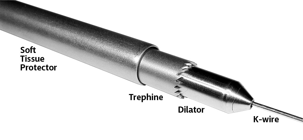 Cannulated T-handle and trephines allow use of a standard 1.6 mm (.062″) threaded K-wire to help facilitate grasping and removal of a core bone sample for biopsy or core decompression