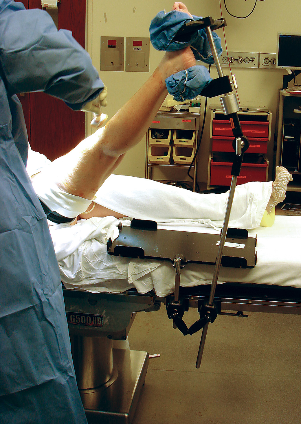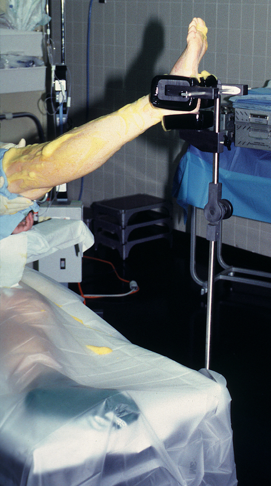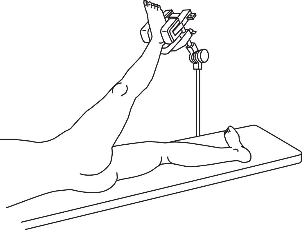 Useful for all lower extremity procedures and is particularly helpful for supporting the leg with the patient positioned in the lateral position. By holding the foot/ankle in an externally rotated position, the knee can be locked into extension which helps eliminate the need for manual support. May also be used to support the limb for surgical patients in the supine position such as for knee and foot/ankle procedures.