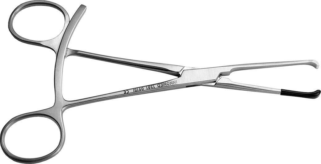 A traditional Allis Bone Clamp designed with a longer ratchet—for a wider opening to allow a bone and plate to be clamped and locked onto—and one coated end to prevent from marring a component surface