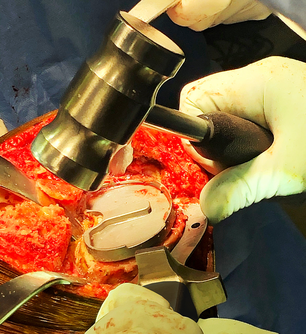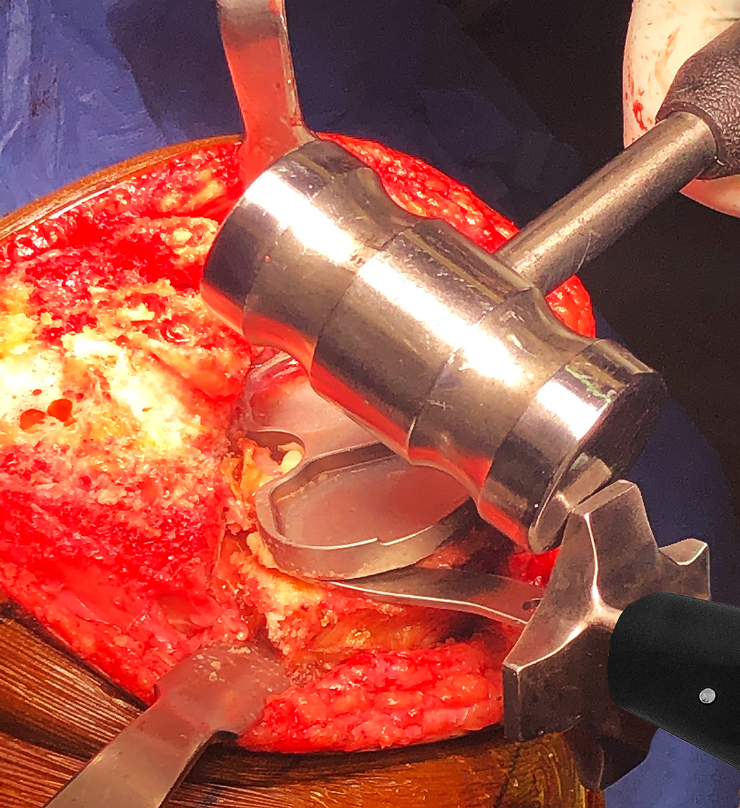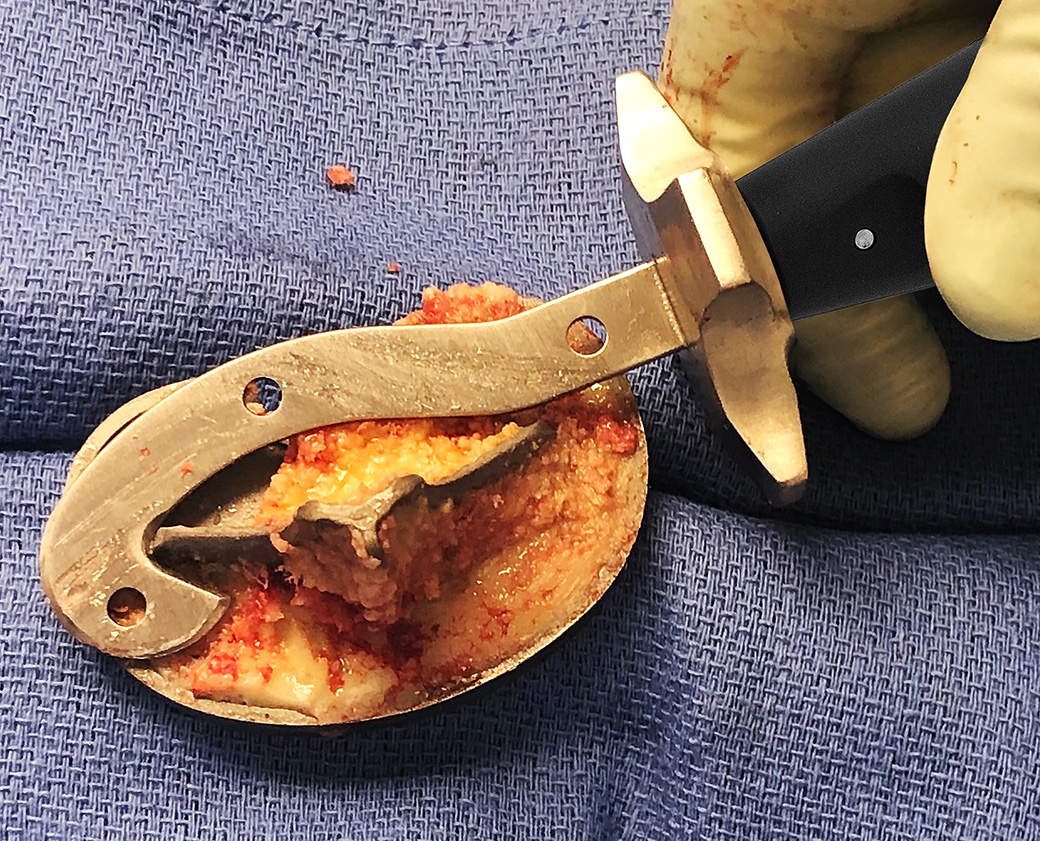 Designed to help in the removal of a tibial component, the curved blade is designed to make contact from multiple angles