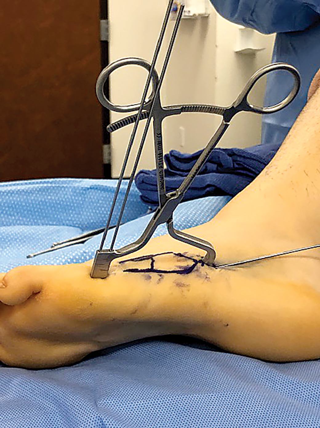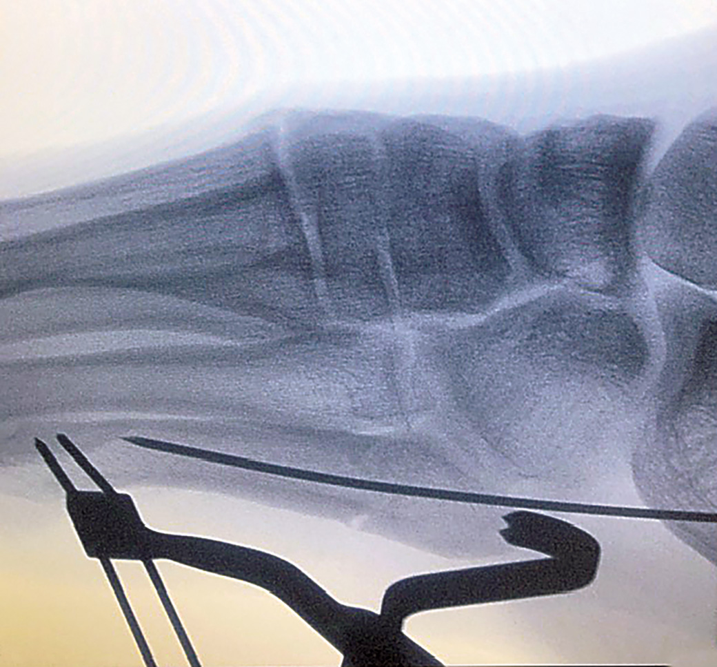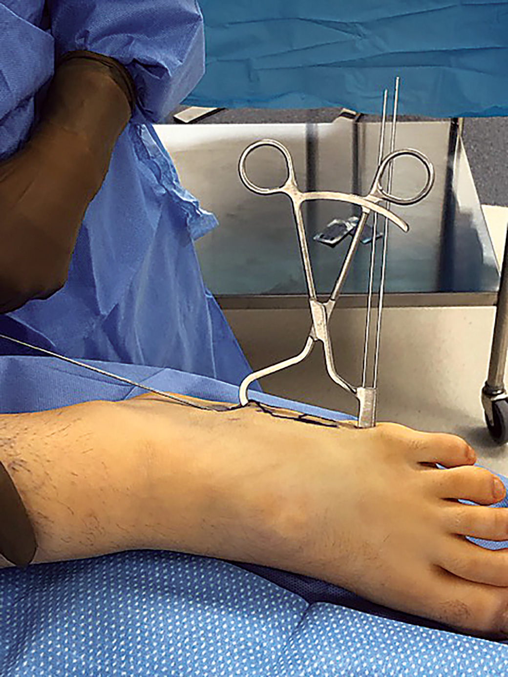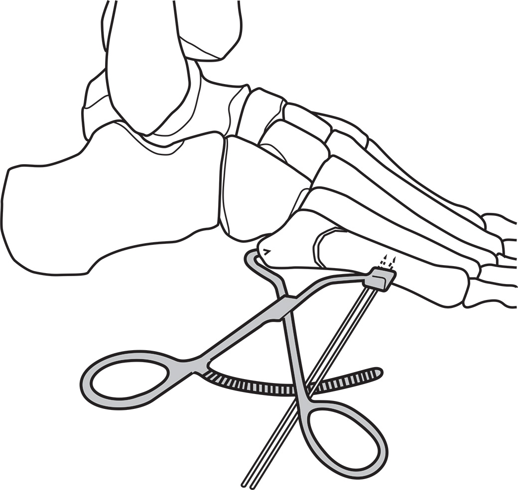 Distally there are two k-wire holes for placement in the distal 5th metatarsal and the 2-pronged clamp proximally is placed on the tuberosity, allowing a “high and inside” screw placement without interference.