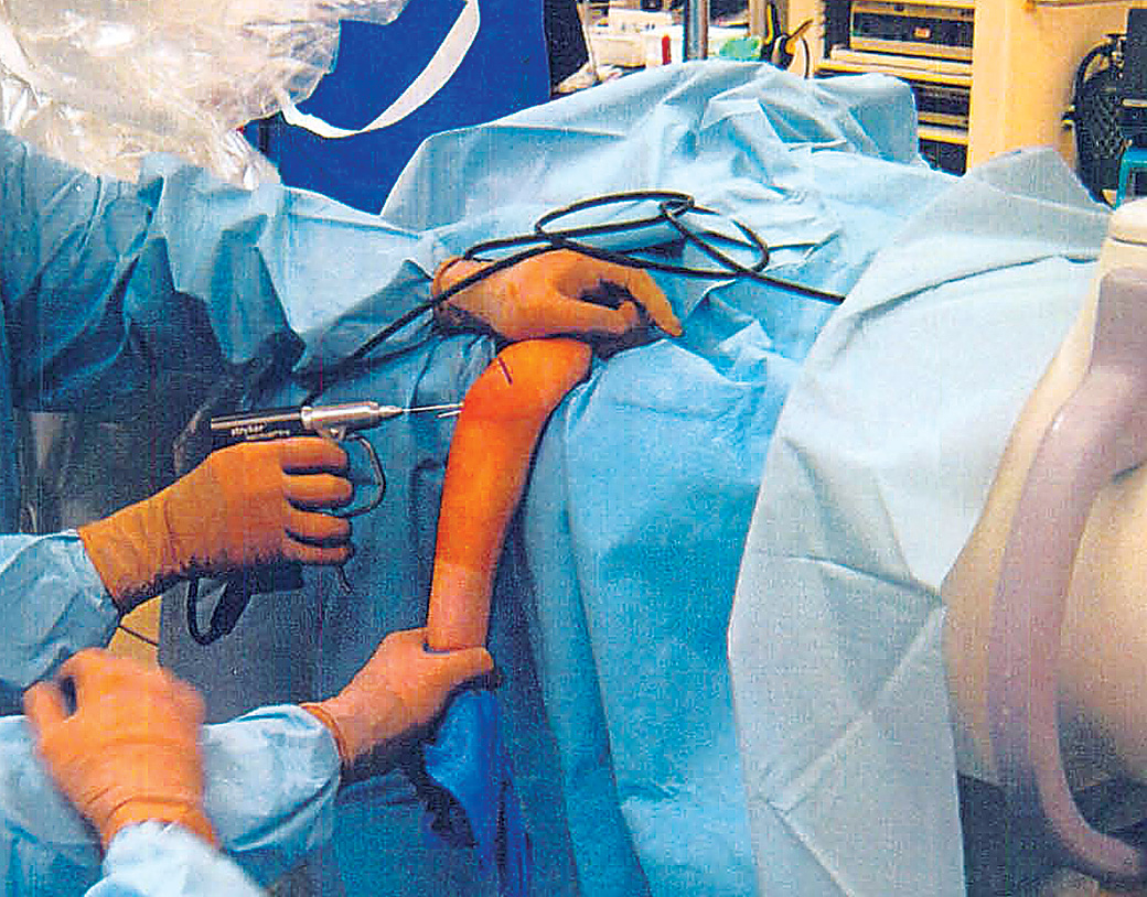 Allows the surgeon to pin these fractures without having to manually hold the fracture reduced, allowing the surgeon to focus on accurate pin placement and reduction. The height of the crossbar is fully adustable to accommodate different size patients. Reduction is acheved by an assistant gently applying axial traction through the forearm, with the crossbar applying the counter traction. Pinning is done with the C-arm in the lateral position. An optional separate attachment to support the arm for distal humerus fractures in adults is available. Unit not sterilizable.