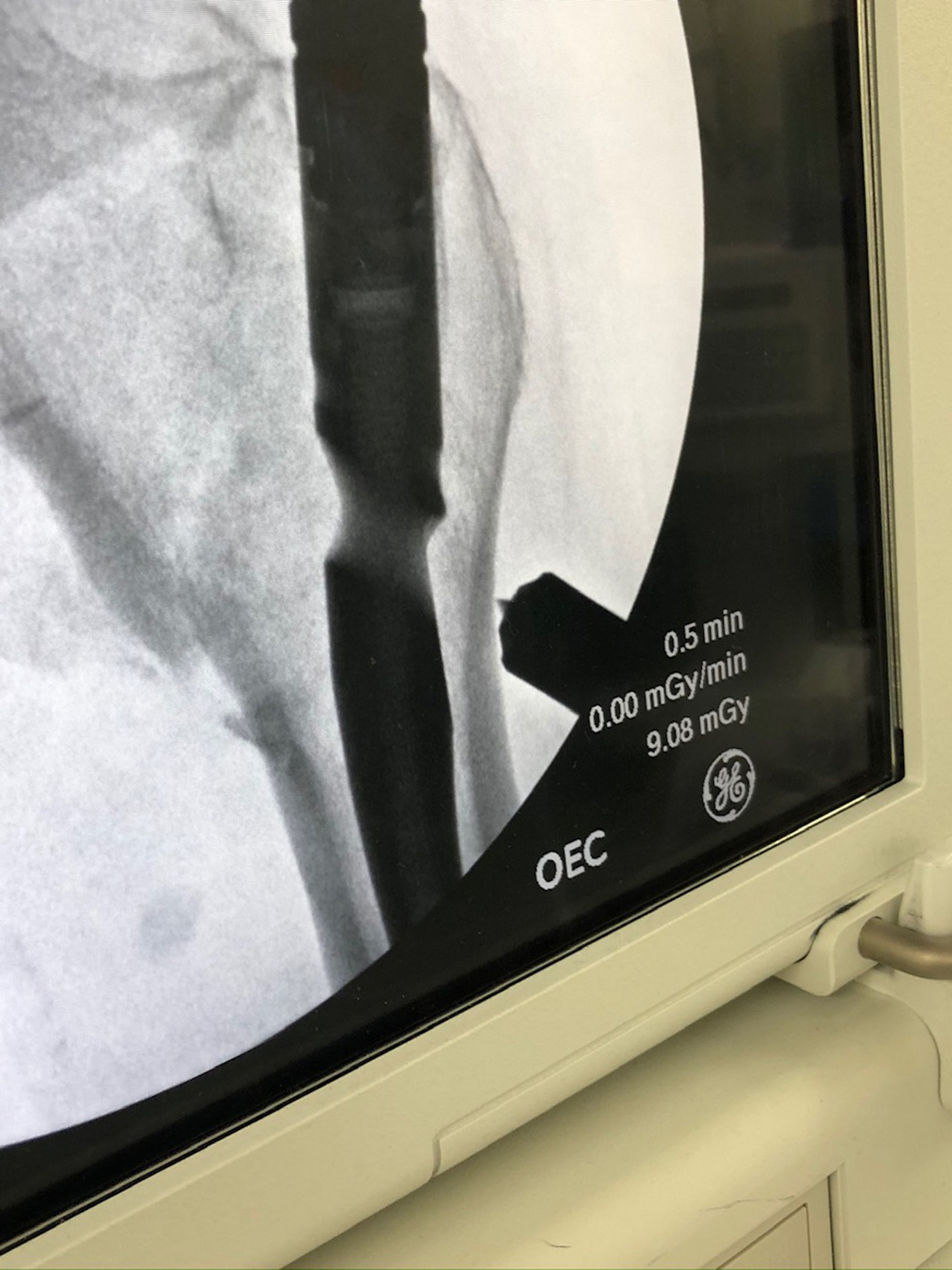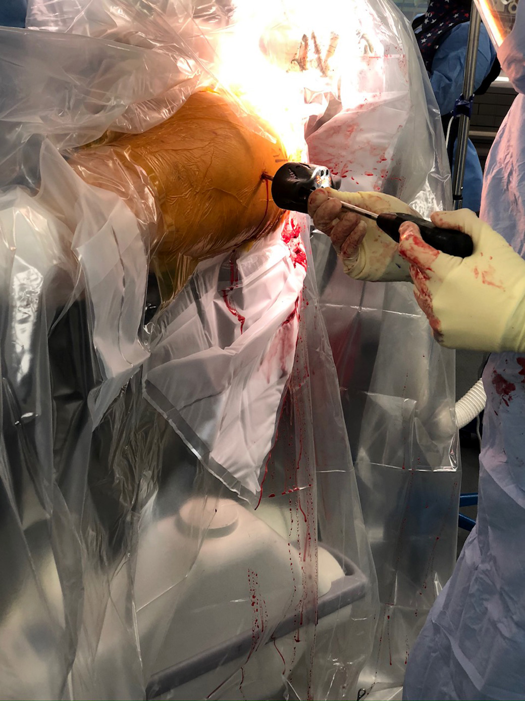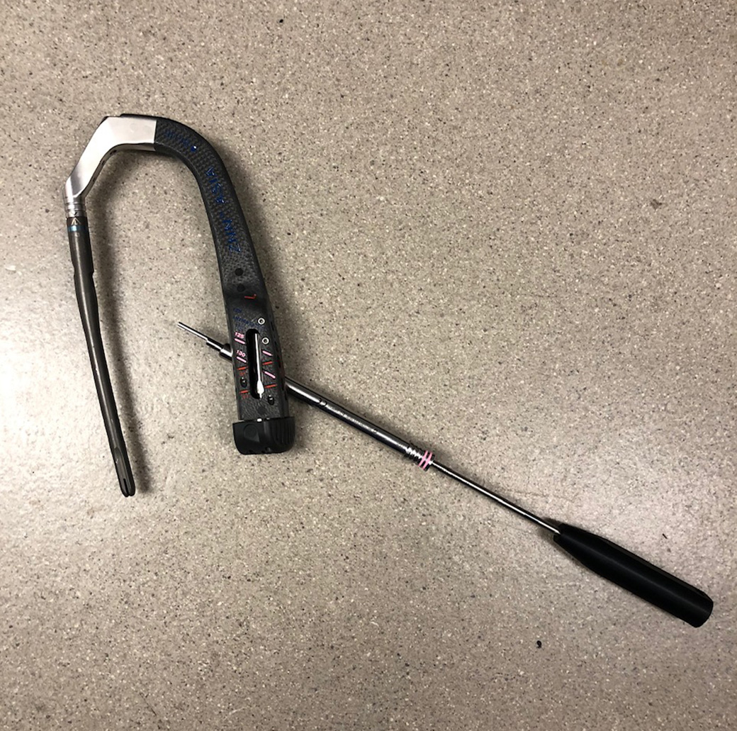 Long thin scalpel handle used with knife blade to make a skin incision and cut through fascia to help seat trocars to bone