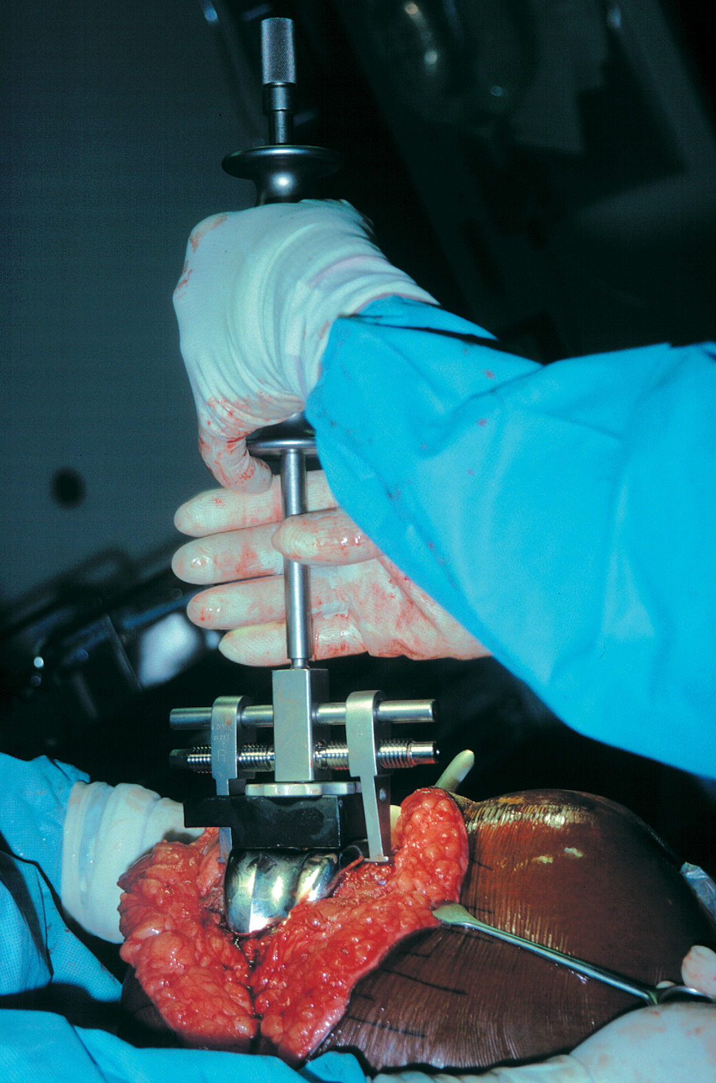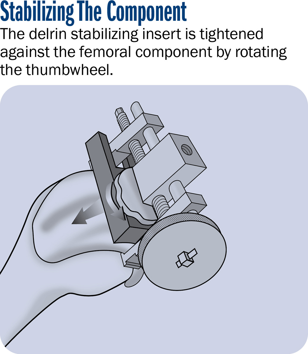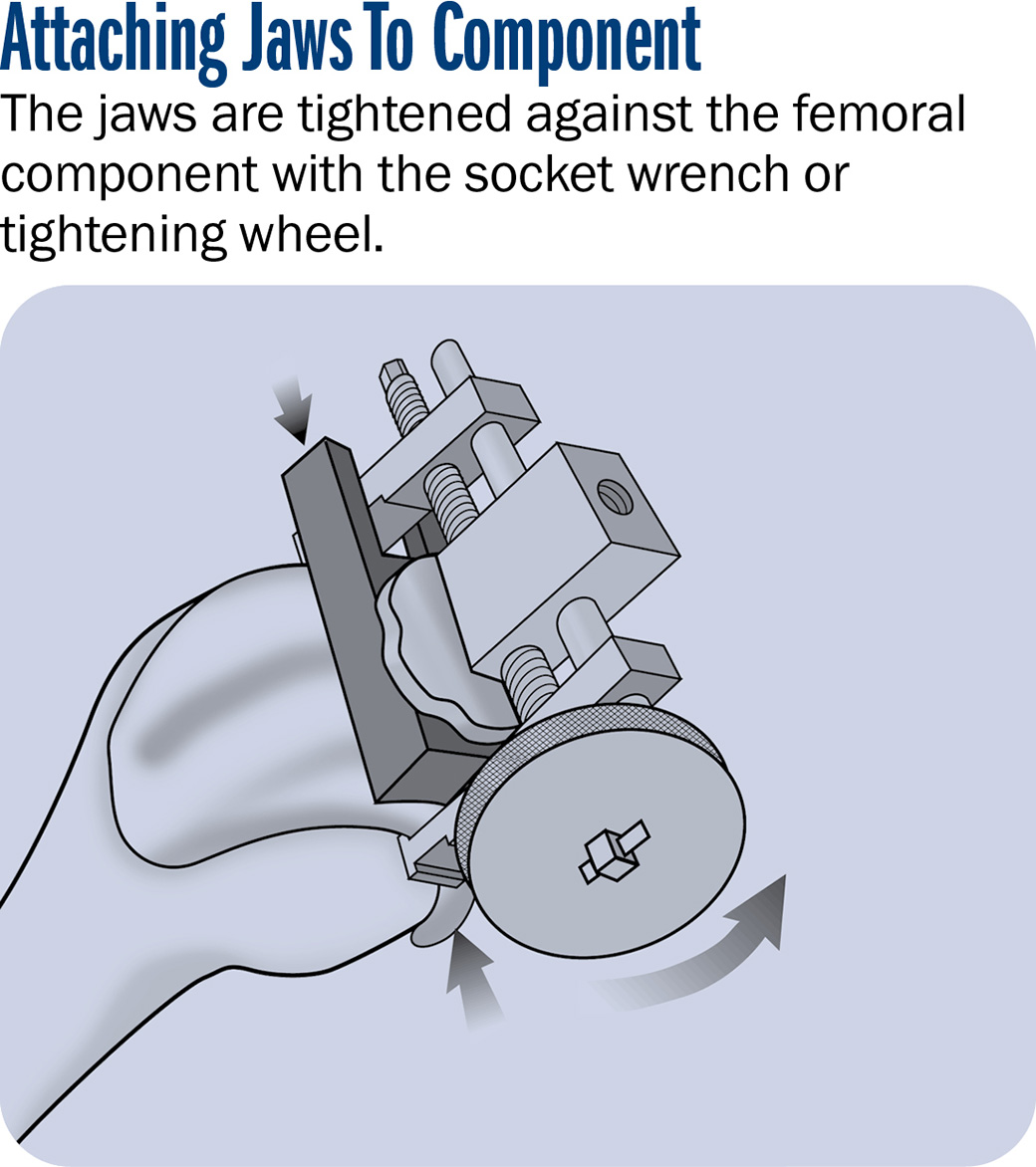 A standard set of jaws is used for slotted and unslotted femoral components. Features a round tightening wheel which allows the surgeon to easily tighten the jaws without using a separate socket wrench. The tightening wheel can be easily removed for replacing the jaws. The copolymer prosthesis stabilizing block allows access to the block tightening wheel. Includes standard slap hammer.