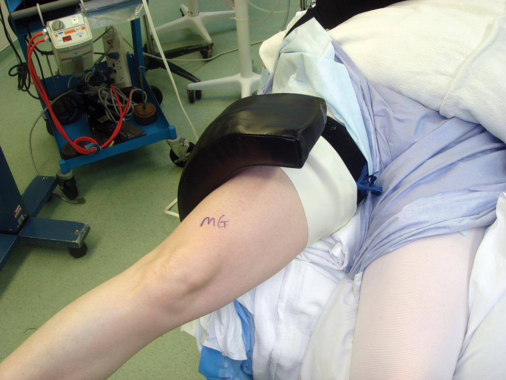 Shape does not squeeze the thigh, making the need for a thigh tourniquet optional. If desired, the unit can easily be rotated out of the way without disrupting the sterile field. Using with a standard operating table clamp, the unit can easily be raised or lowered to accommodate all thigh sizes.