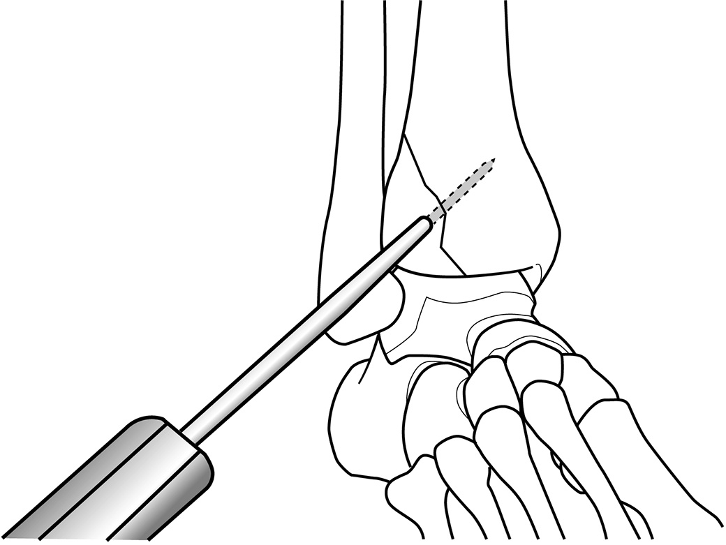 A cannulated spiked tip awl designed to help safely and accurately place standard K-wires up to 0.0825” (2,1 mm) with either open or percutaneous techniques, helping to avoid soft tissue injuries that may occur without the use of such devices