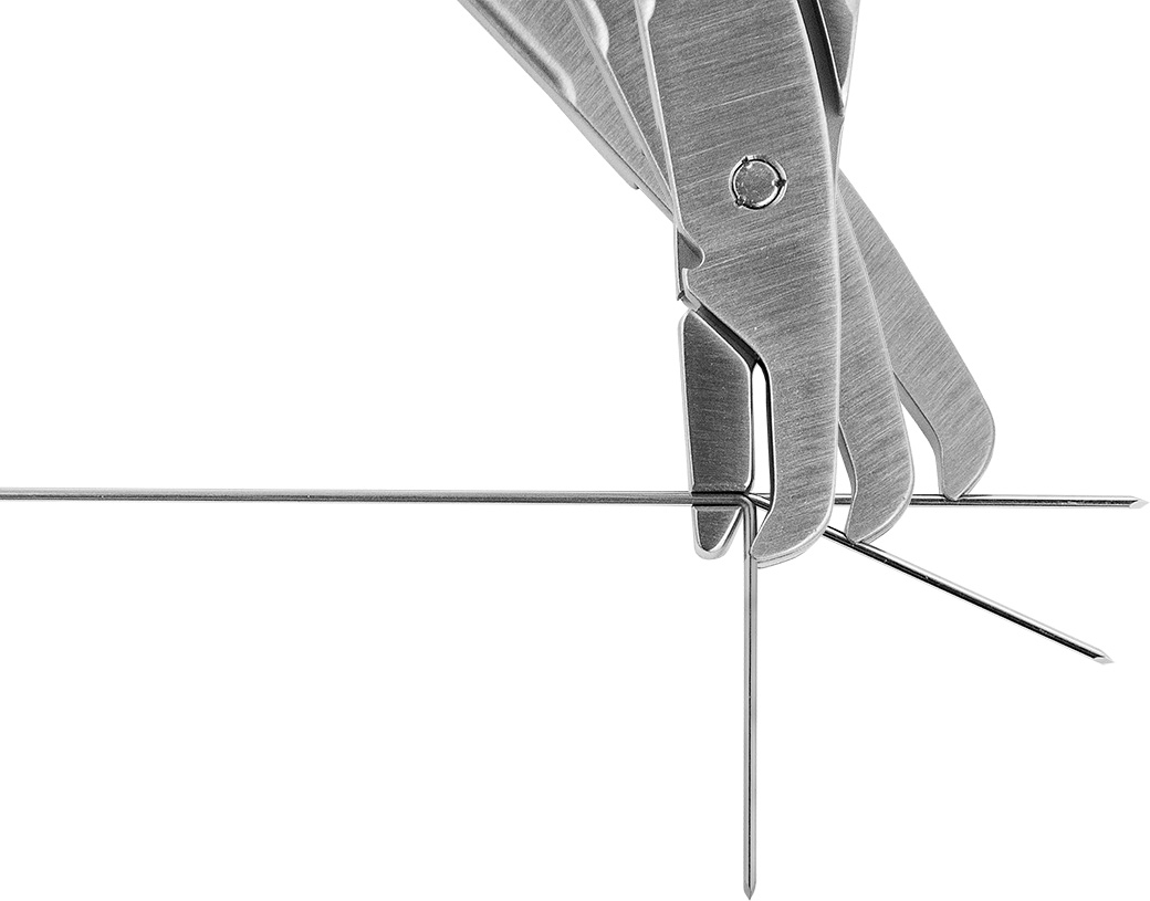 The K-wire only needs to extend 20 mm from the skin surface to be bent. Can bend and cut K-wires measuring 1 to 1.6 mm (.039″–.062″) in diameter