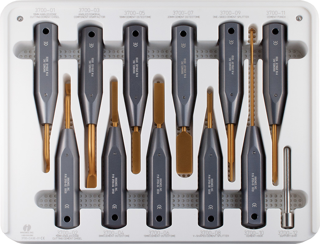 Set Includes / Available Individually: 3700-01 [Offset Edge Cutting Cement Chisel, Short] 3700-02 [Offset Edge Cutting Cement Chisel, Long] 3700-03 [Offset Femoral Component Dis-impactor] 3700-04 [8 mm Cement Prosthesis Osteotome] 3700-05 [10 mm Cement Prosthesis Osteotome] 3700-06 [13 mm Cement Prosthesis Osteotome] 3700-07 [20 mm Cement Prosthesis Osteotome] 3700-08 [V-shaped Cement Splitter] 3700-09 [One-sided Cement Splitter] 3700-10 [8 mm Cement Hook] 3700-11 [Cement Punch] 3700-12 [Removal Cross Bar] 3700-CASE [Case]