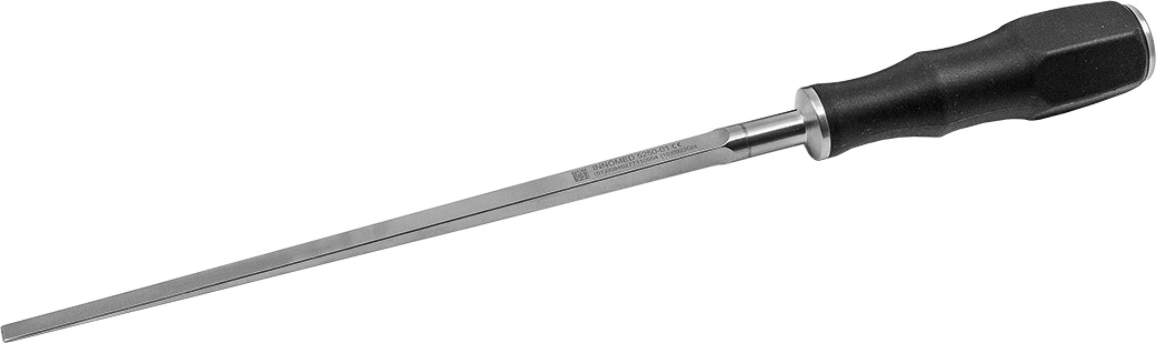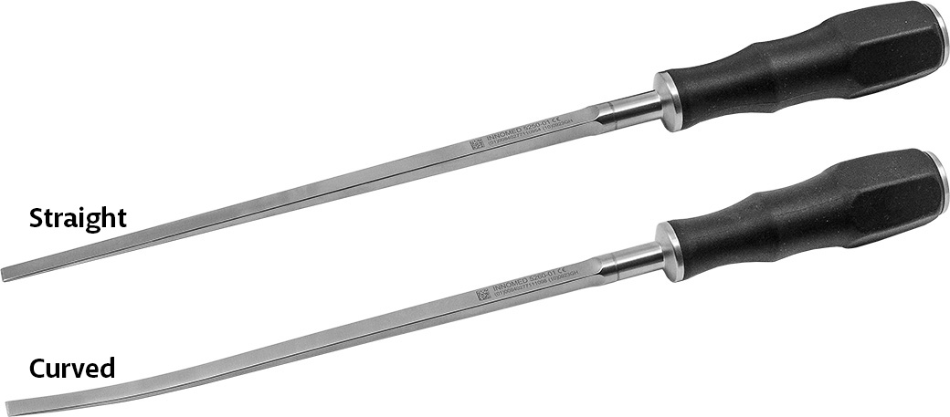 The handle also provides a larger striking area for use with a mallet. The osteotome shafts are manufactured with stainless steel and are available both straight and curved in 1/4″ blade width.