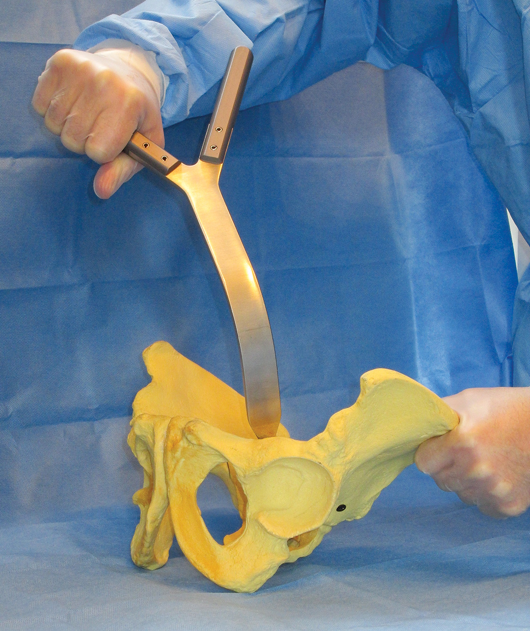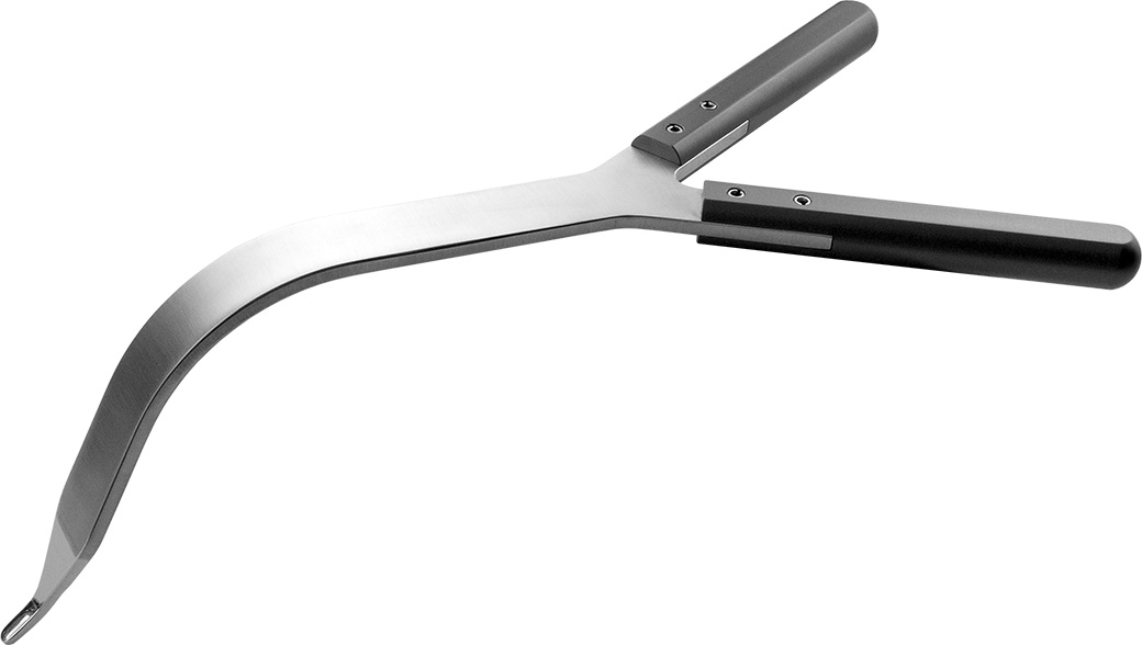 Designed for use over the anterior pelvic rim during acetabular exposure in direct anterior THA, the dual handle design allows for use in both right and left hips, as well as easy exchange of the instrument between assistants