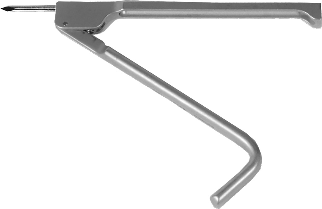 Completely cannulated allowing use on long pins where the instrument can be next to the bone or skin for stability and control. The grasping end is contoured to not block the surgeon’s field of view. The handle is shaped so not to slide in the surgeon’s hand and for better leverage. May also be used to pull a drain needle from the surgical site. The design helps to protect operating personnel from the sharp tip of the needle.
