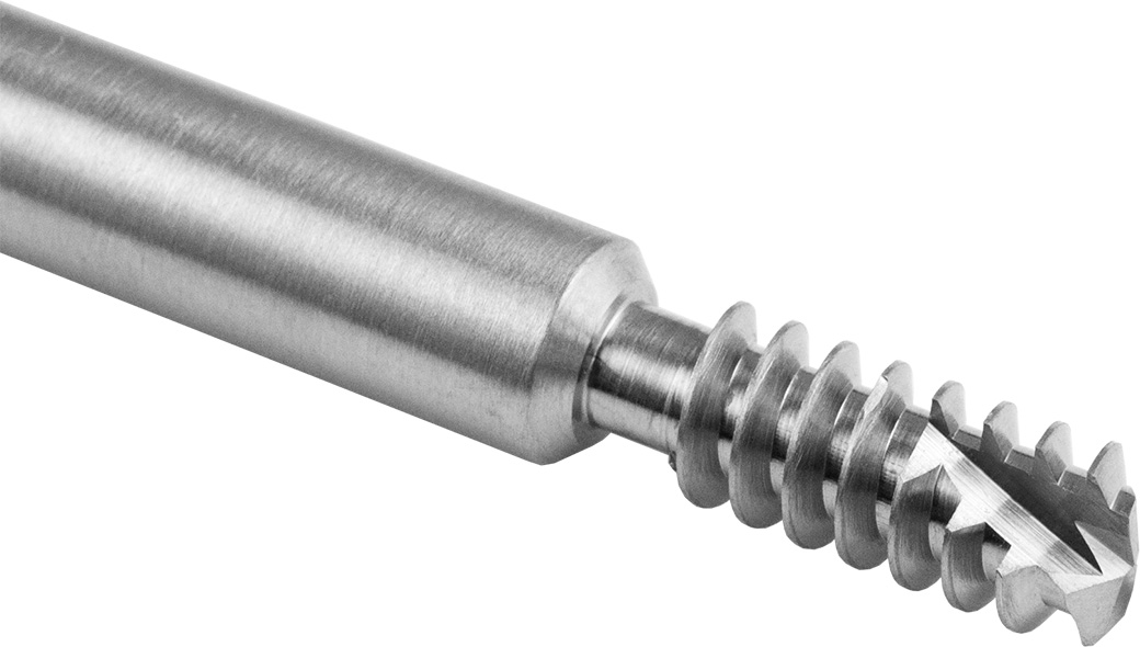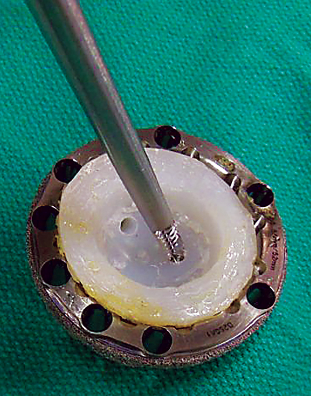 When the flat-ended drill end reaches the metal of the acetabular cup, continue drilling and the liner will become engaged in the drill flutes and back off for removal.