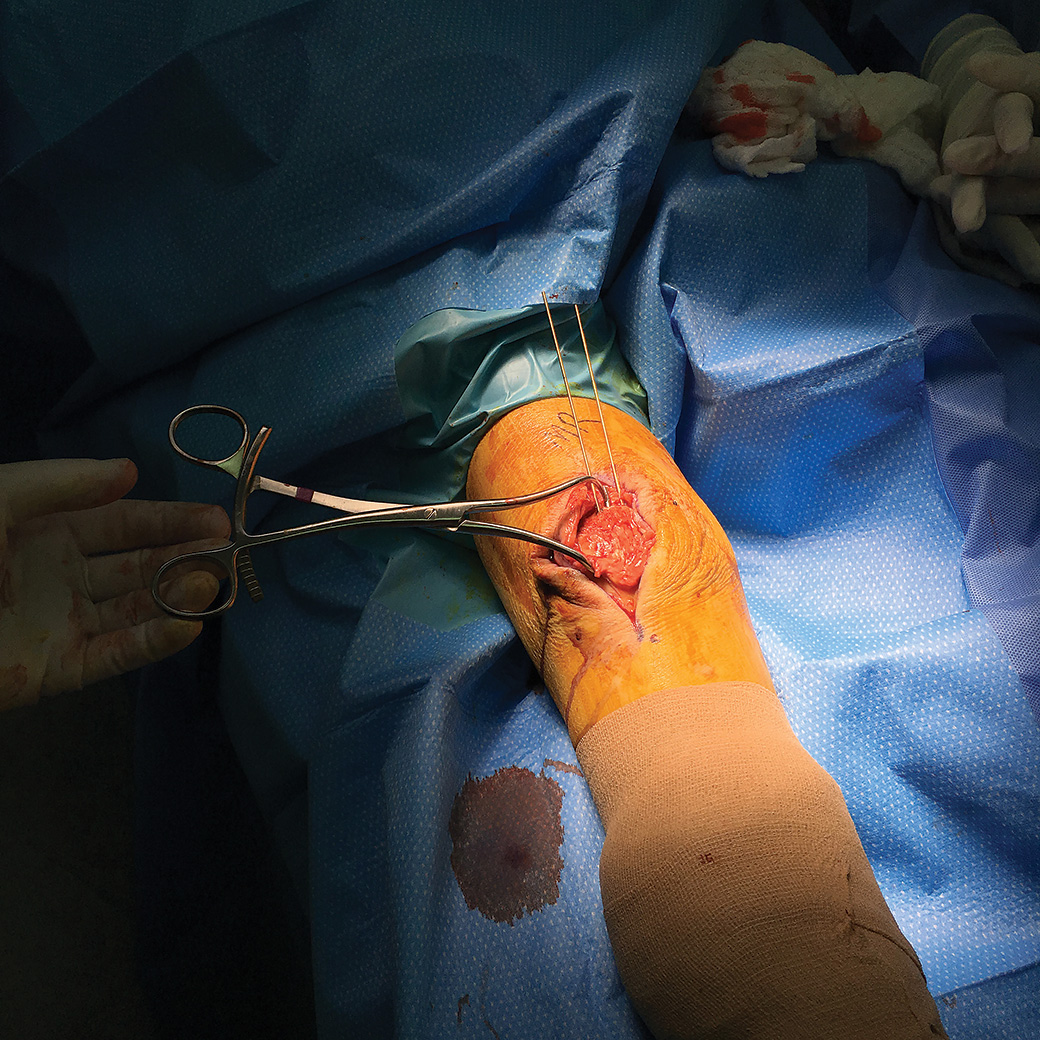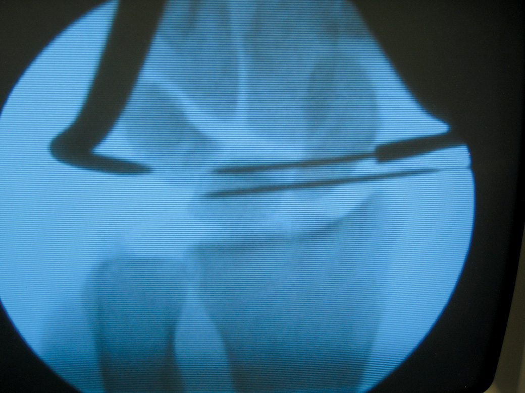 Placement of guide wires during the open reduction and internal fixation of a patella fracture.