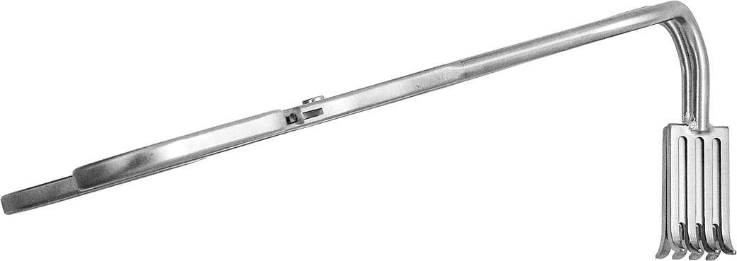 Self-leveling retractor that helps lessen tissue movement underneath the prongs, thereby helping to maximize exposure