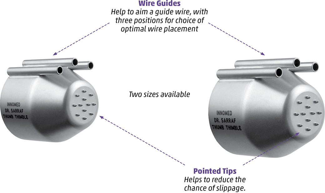 Provides the surgeon with an instrument for maintaining a fracture fragment in the appropriately reduced position during application of K-wires. Helpful in osteoperotic bone that is not amiable to forced reduction using reduction clamps. The wire guides help to aim the K-wire, with three positions for choice of optimal placement and for parallel wire placement. The pointed tips at the end of the thimble help to reduce the chance of slippage while maintaining a fracture reduction.