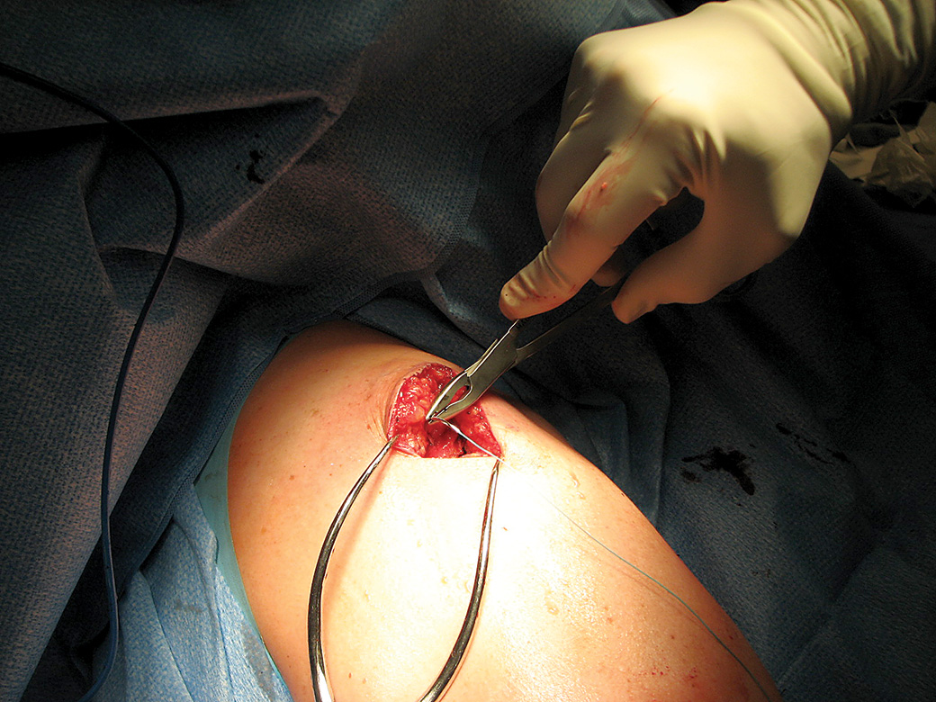 Allows a heavy cutting needle such as an OS-6 to be pushed through cancellous bone when re-attaching muscle or tendon