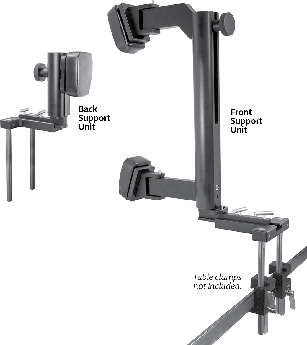 Set Includes / Available Individually: 4160-07 [7″ Back Support Post] 4160-18 [18″ Post with Fixed Lower Arm] 4160-AA [Adjustable Upper Arm] 4160-DTA [Double Table Attachment] Two (2) included with set; One (1) only with this number 4160-PB [Post Knob] Two (2) included with set; One (1) only with this number 4150-P [Pad Plate for Back Support] 4150-PD3 [Set of Three (3) Pads] 4150-S [Back Support Slider]