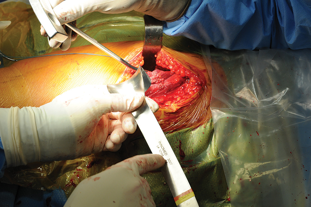 Designed to be placed over the TFL for soft tissue retraction and protection prior to using a femoral neck elevator.