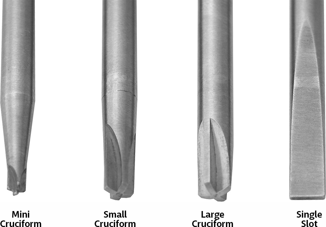 Standard cruciform screwdrivers in large, small, and mini, and single slot.
