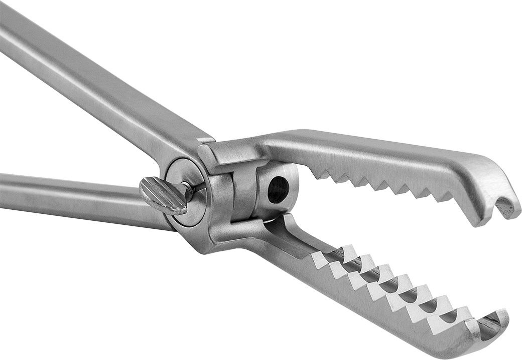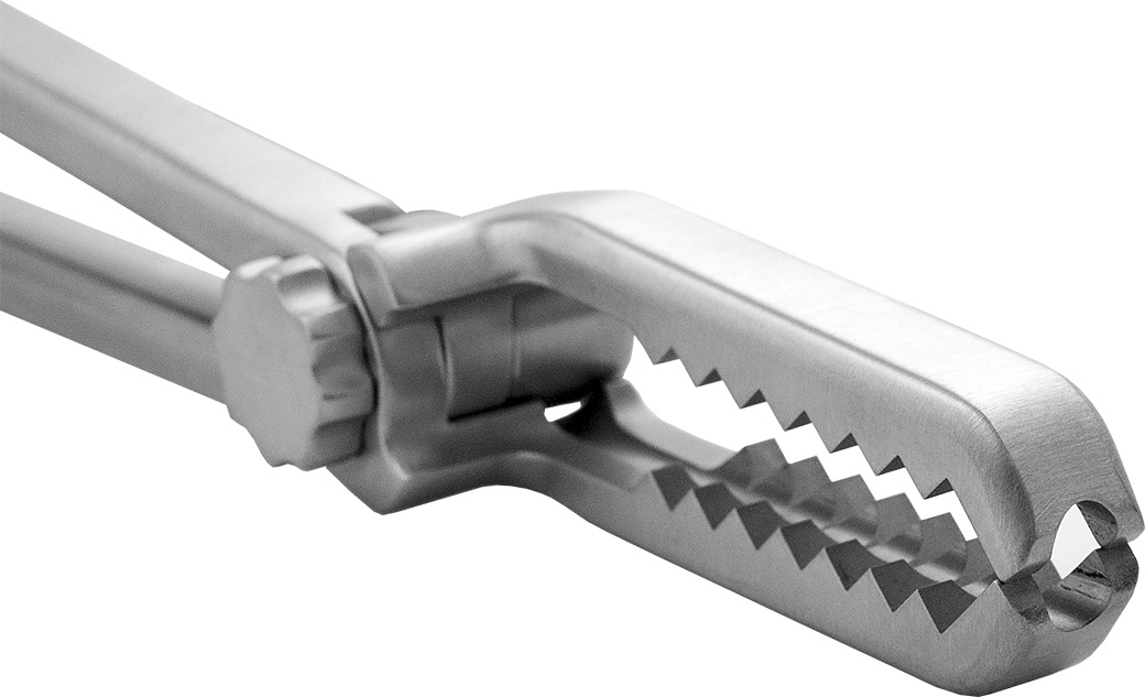 The cannulated center hinge allows a 5 to 6 mm Schantz pin (not included) to be used in conjuction with the clamp — providing a unified pin-and-clamp together that is stronger than each separately and offers enhanced fragment control.