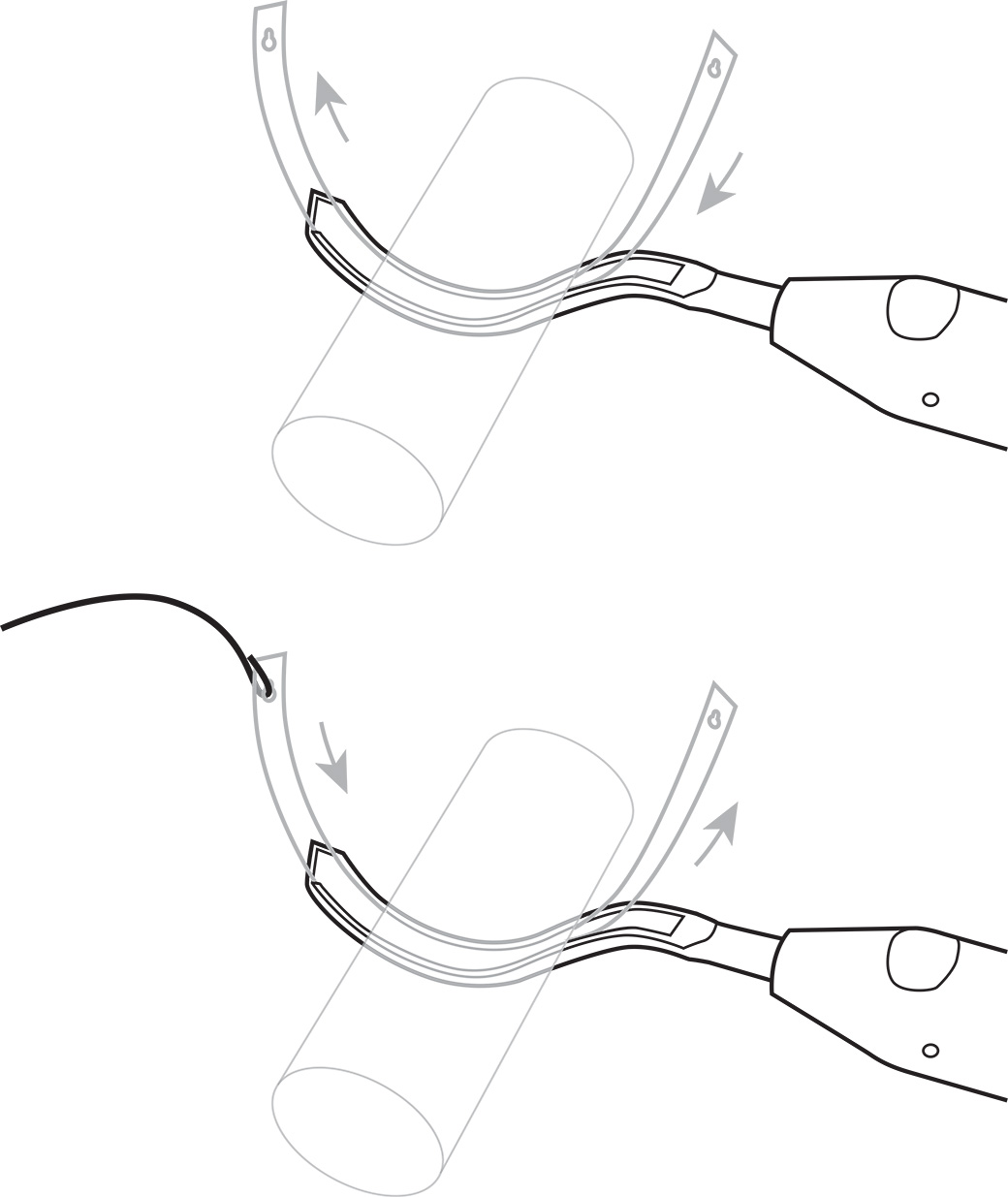 The passer guide is placed around the bone, and the thin malleable passer is inserted at the handle end and follows the grooved passer around. The suture wire (up to 18 gauge) is attached to the keyholed end of the passer, which can then be reversed out of the passer, drawing the suture wire around the bone.