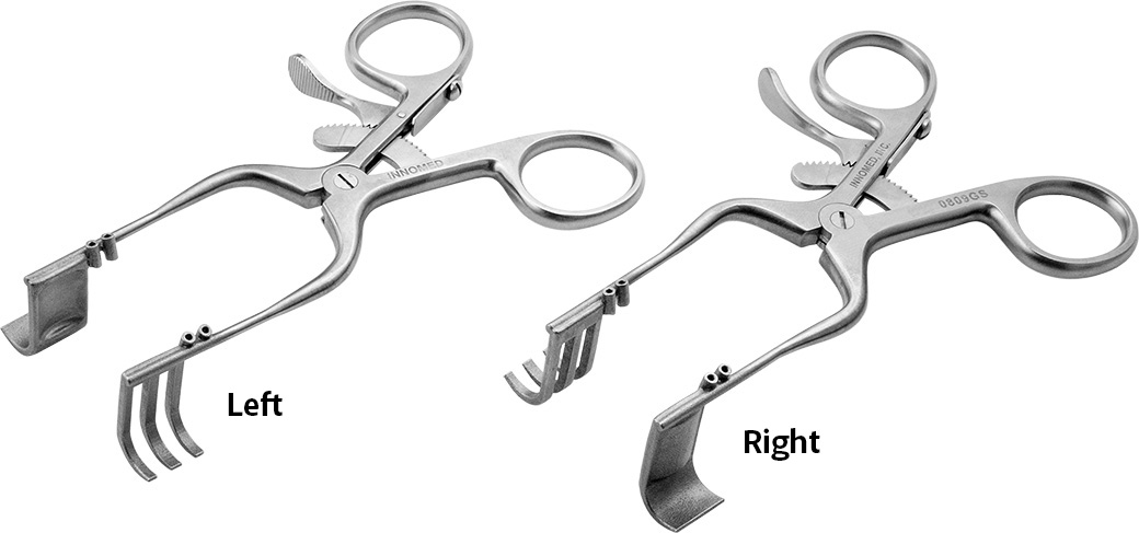 Long straight arms allow parallel retraction of the incision, while the deep blades with a pronounced distal “curl” help maintain soft tissue retraction.