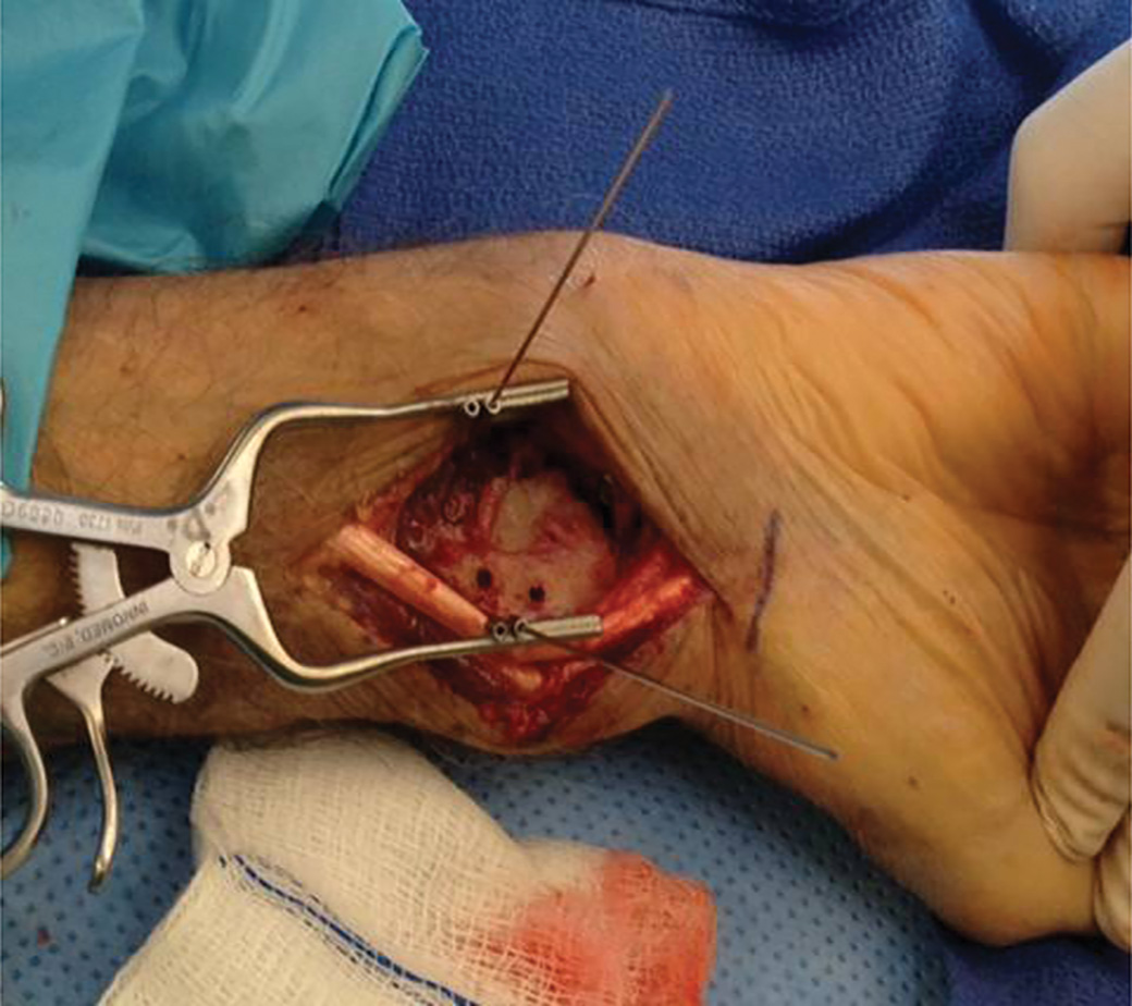 Two .045” (1.1 mm) guidewire holes are attached to the arms just proximal to both blades. The holes are angled in slightly varying directions to allow choice of placement of stabilizing pins into the distal radius to prevent rotation or migration of the retractor throughout the procedure.