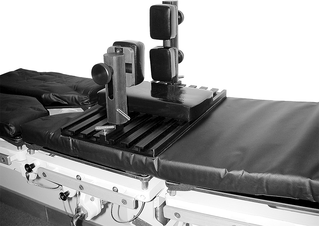 The pad assembly can be adjusted for additional height and width. The upright posts are modular. The complete unit is radiolucent, and all parts are autoclavable except for the washable foam pads.