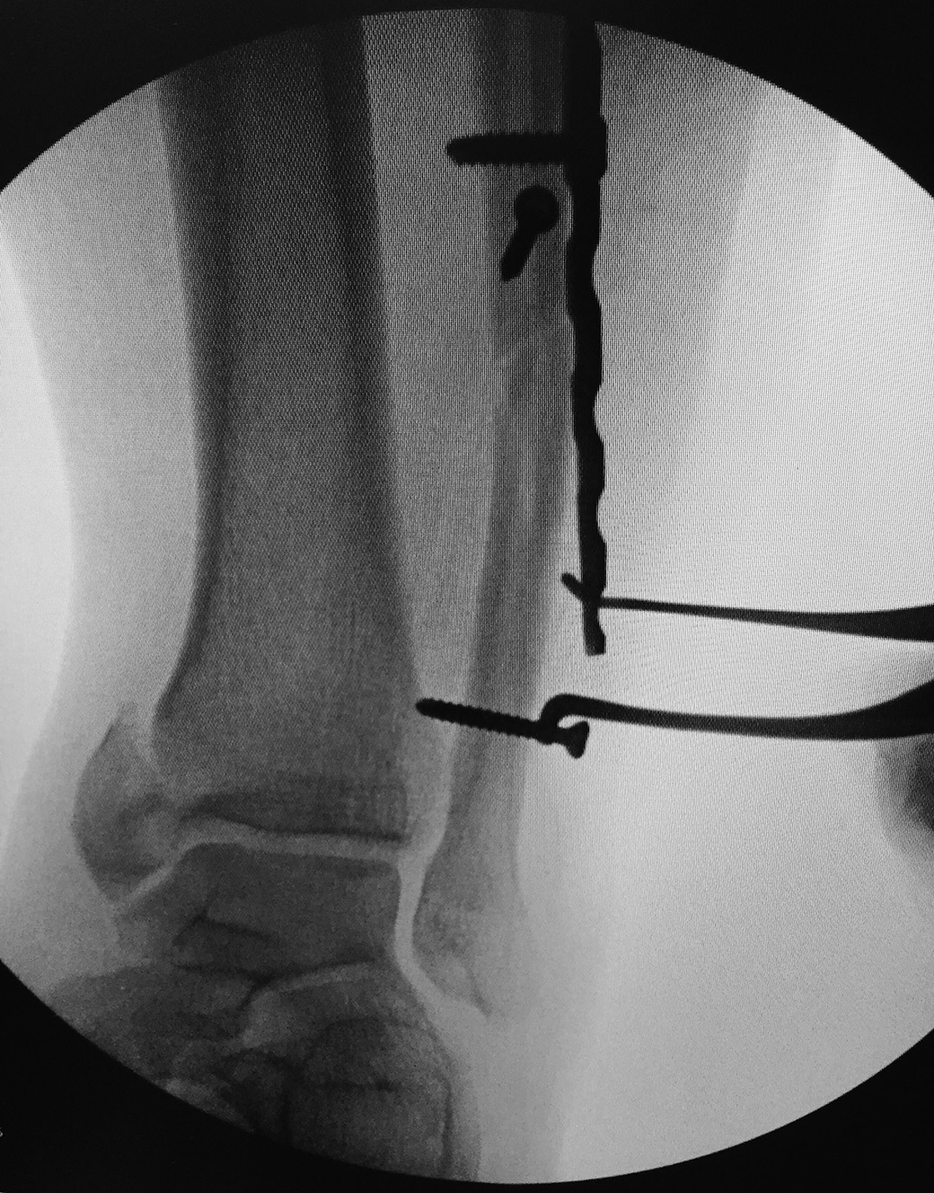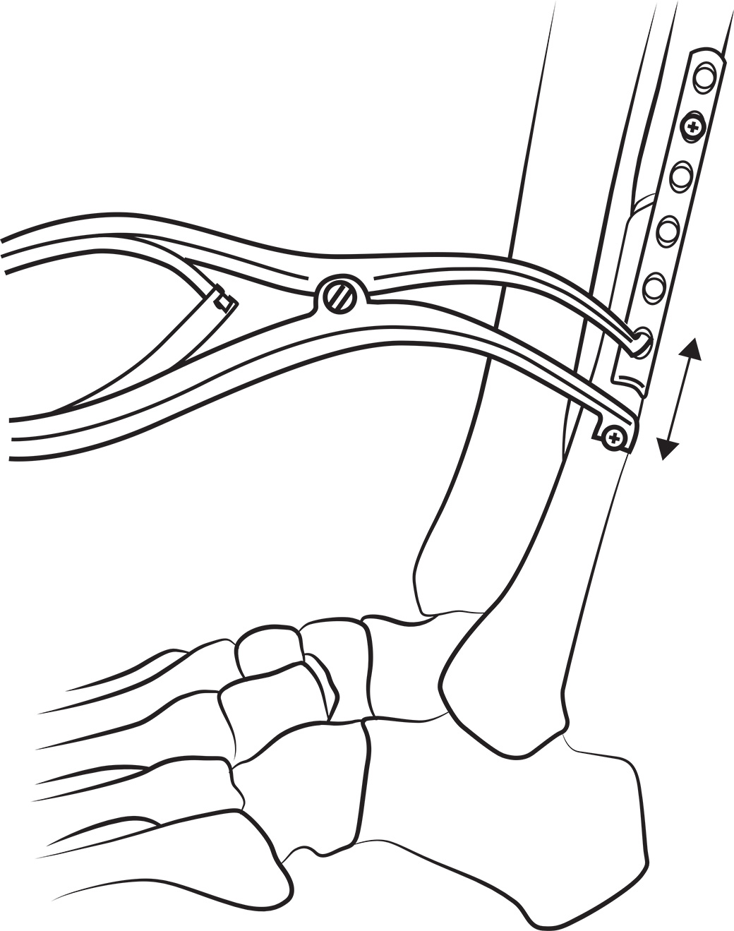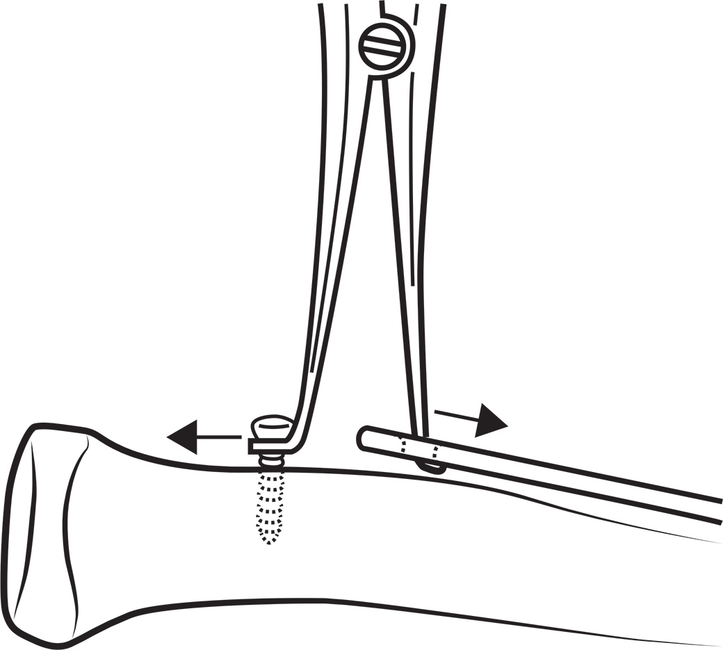 A 3.5 mm screw is temporarily placed above a plate, providing a source of leverage for the screw holding end of the distractor. The curved peg-shaped tip is then placed into a hole in the bone plate, and the distractor is activated to bring the bone back to its proper length before fixation.
